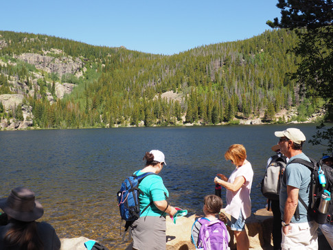 We arrived to plenty of spaces in the parking lot (we had heard it can get very crowded so we wanted to try to avoid having an issue) and were there with some time to spare before the doors opened. Grams and the girls took that time to go to the restroom. While Pop, Adam and I were waiting I saw what at first looked like a big dog with puppies behind it running in the field across the street. I quickly realized that would not make any sense and it was most likely a bear and her cubs. I told Adam and Pop and we all confirmed it was definitely a bear and her cubs as we watched them from afar running through the grass. They were sadly too far and too fast to get a picture. When the girls came out of the bathroom we let them know and they were pretty disappointed to miss it. At that point the center was open and we went inside. We received the Jr. Ranger books as quickly as we could and headed over to our first trailhead at Bear Lake. As we were walking to our car we heard another visitor telling a ranger she saw the bear with her two cubs up the road from where we had our sighting. We opted to drive instead of use the park shuttle because we were hoping to be able to make it to our dinner show that got rescheduled from the previous night. A few minutes into the drive Adam had the idea to give Grams and Pop one of our walkie talkies so we could talk to them the whole way there (there is no cell reception in the park) and the girls were having fun taking turns talking and giving bear sighting reports (that no bear was sighted, still no bear sighting...). We all thought it was so interesting to see one lone person with an easel set up and painting as we drove past the wide open land in front of the Discovery Center. As we got to the parking lot at Bear Lake we realized this may not have been the best choice. It was a relatively small lot and seemed to be completely filled. We lucked out and got a spot as someone pulled out but Grams and Pop weren't so lucky. It was great that we had done the walkie talkies so we could keep in touch when they were within range of us. We sat with the girls and worked on their Jr. Ranger books while Grams and Pop went to the Park and Ride lot (which thankfully they said was huge and had plenty of open spots) and took the shuttle to Bear Lake.