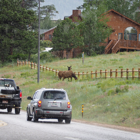 Grams and Pop went back to their hotel to get ready for dinner. We started going over to the Estes Park Visitor Center to hand in our completed Pica Hunt papers. As we were driving Grams called to tell us Pop realized we should go on our way to dinner instead. Right after that we saw an elk grazing right on the side of the road. We slowed down and were able to pull over. As we looked back we saw another elk had joined the first one. And then directly in back of our car another horned elk had emerged and tried to cross the street. We stayed here for awhile watching the elk who eventually were all able to make it to the other side of the road as they crossed the stopped traffic. The girls loved watching them jump the fence on the opposite side of the road.